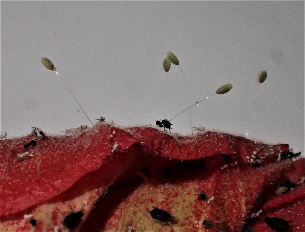 G. Nikoletta kérdése: A hibiszkuszomon nagyon sok a levéltetű, de mellettük hosszú száron apró, fehér színű tojásokat is észrevettem. Mik lehetnek ezek?