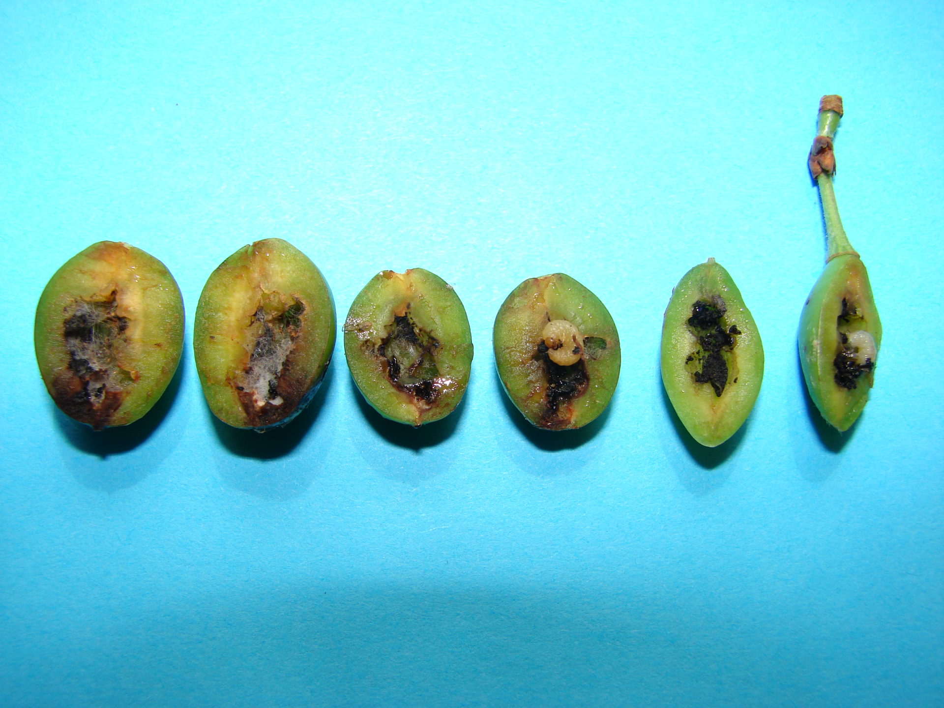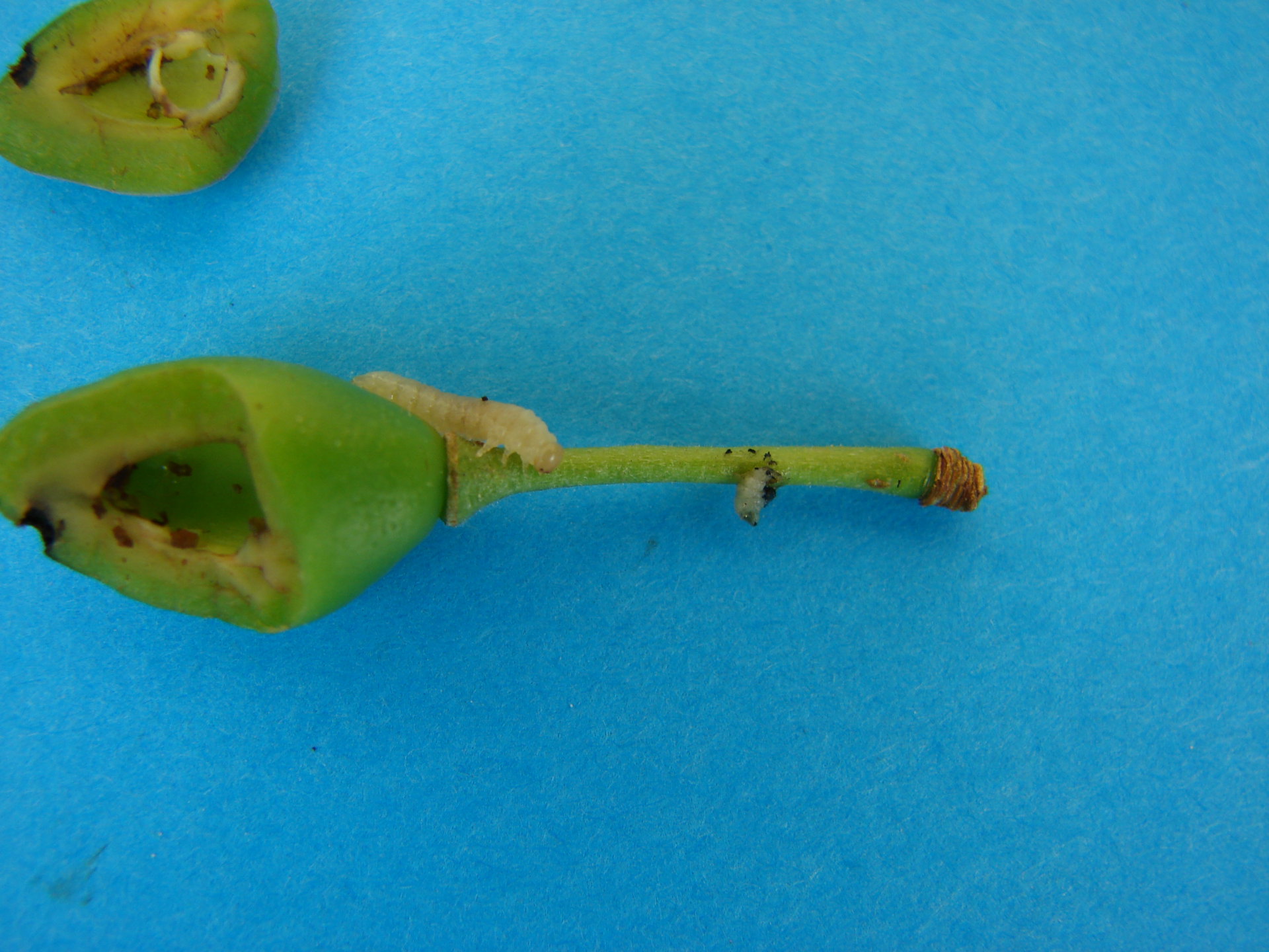 Kárkép jellemzője: Az egészséges, gyors növekedésnek indult termések között, a fejlődésben lemaradt, apró terméskezdemények a fertőzöttek, melyek belül üregesek, bennük a fejlődő, csontszínű 6-10 mm hosszú, 3 pár lábbal rendelkező lárva és sötét színű ürüléke figyelhető meg.